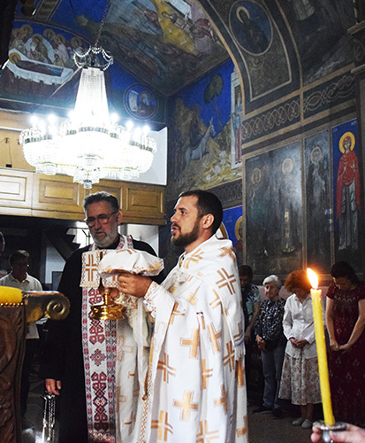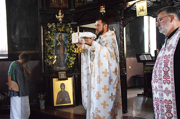 На празникот на +Седумтемина Макавеи, нивната мајка Соломонија и свештеникот Елеазар; Изнесувањето на Чесниот Крст; Светите девет маченици: Леонтиј, Атиј, Александар, Киндеј, Минситеј, Киријак, Минеон, Катун и Евклеј. отец Антониј Јосифоски во сослужение на  старешинта на храмот о.Томе Велјановски отслужи Божествена Литургија во храмот на св.Петка (во скопската населба Црниче.) Верниот нрод се причести со Светите Христови Тајни.По Литургијата во чест на празникотИзнесувањето на Чесниот Крст;се направија молитви и водосвет.